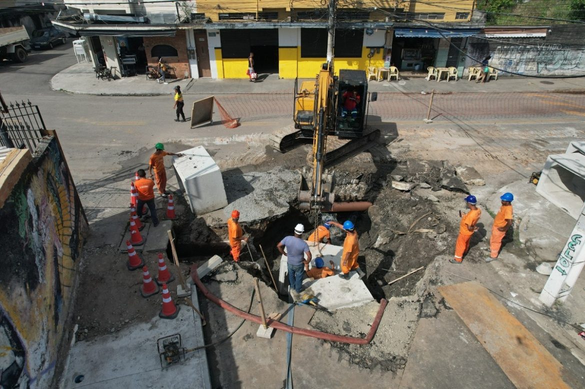 Atualmente, as equipes trabalham na instalação da rede de drenagem na Rua Galvão, entre a Américo Vanique e a Craveiro Lopes, incluindo a instalação de galerias com dimensão de 1,5m x 1m.