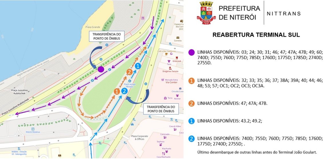 O Terminal Sul, localizado na Avenida Visconde do Rio Branco, no Centro, será reaberto neste sábado (14). O espaço ficou fechado por pouco mais de um mês para obras de ampliação. O terminal teve a capacidade ampliada em 50% e ganhou uma terceira plataforma. Os pontos em frente à antiga loja da Leader e junto à praça Arariboia serão desativados e os ônibus vão passar a parar no Terminal para que eles possam acessar à faixa da esquerda deste novo corredor da Avenida Visconde do Rio Branco.