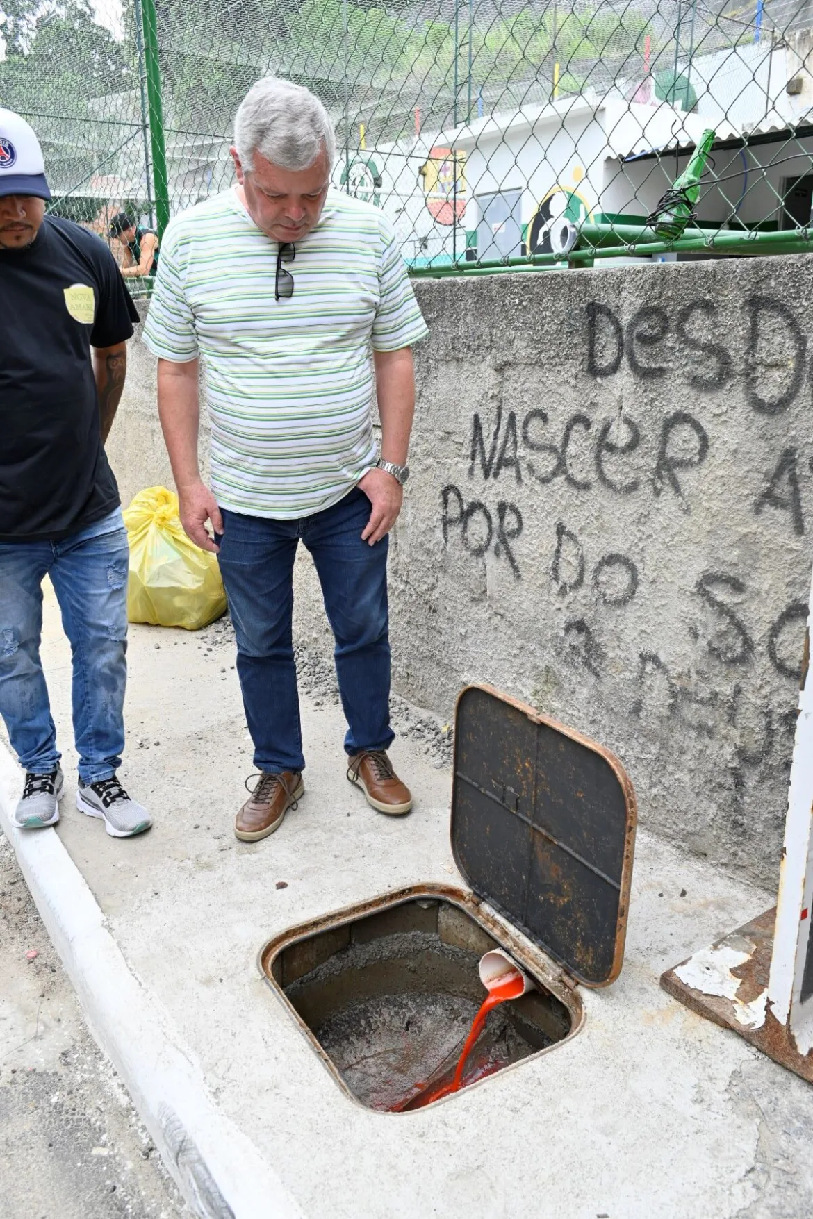 O prefeito Axel Grael esteve nesta quinta-feira (26) na Boa Esperança para uma vistoria. Apenas na comunidade, 270 imóveis estão sendo beneficiados com a ligação gratuita na rede coletora de esgoto. Durante a visita, foi realizado um teste com corante jogado na descarga de uma das casas para avaliar o curso feito pelo caminho da nova rede coletora.